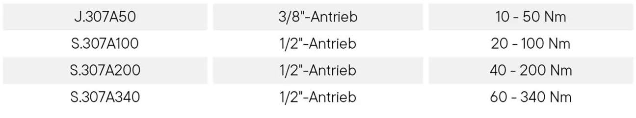 Die Drehmomentschlüssel der Serie 307 sind ausserdem mit einem ergonomischen, stossdämpfenden Zweikomponenten-Griff ausgestattet. Die abrollsichere Form schützt vor versehentlichem Herunterfallen. Sie sind mit einer abnehmbaren Knarre ausgestattet und in den folgenden Grössen erhältlich: