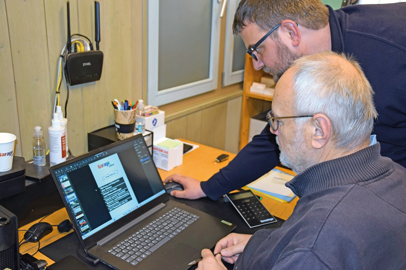 Einfaches Handling: Michael und Vater Andreas Wyden passen am Notebook die Inhalte der Dienstleistungstafel an.