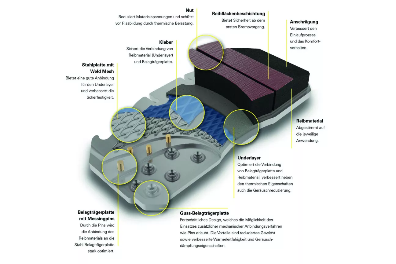 Bremsbeläge sind gerade in Nutzfahrzeugen extremen Anforderungen und Belastungen ausgesetzt. Hier kommt es entscheidend auf die sichere Anbindung des Reibmaterials an die Belagträgerplatte an. Deshalb setzt TMD Friction bei der Herstellung von Nfz-Scheibenbremsbelägen – abhängig vom Anwendungsfall und der thermischen Belastung – innovative und leistungsstarke mechanische Anbindungsverfahren ein: