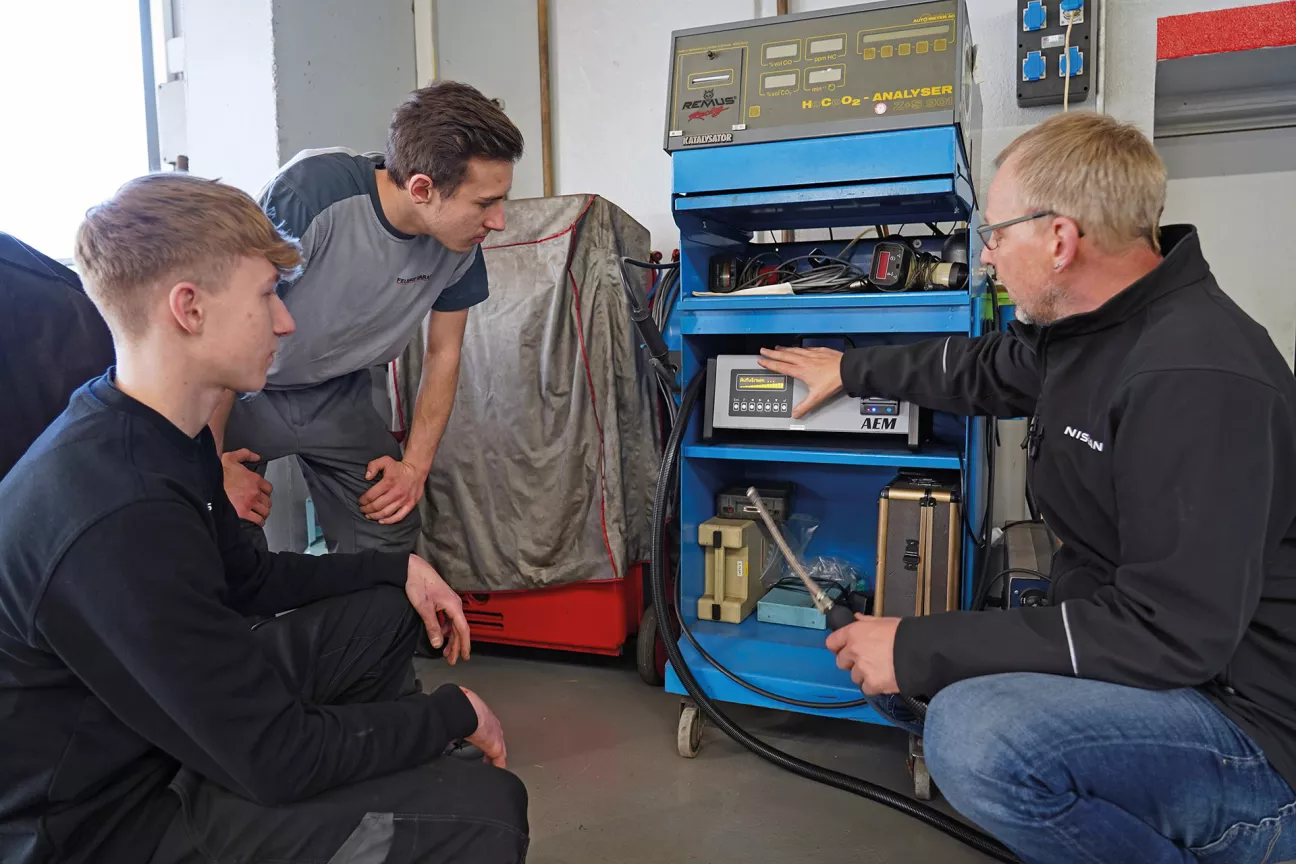 Paré pour l'avenir : Thomas Reinhard (à droite) explique aux deux apprentis Nick Schneider (à gauche) et Fabian Sakhnovski le compteur de particules diesel TEN AEM certifié pour le contrôle officiel en Suisse.