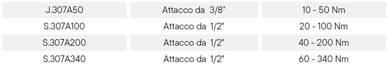 Le chiavi dinamometriche della serie 307 sono inoltre dotate di un'impugnatura bicomponente ergonomica e ammortizzante. Il design anti-rotolamento protegge dal rischio dalle cadute accidentali. Sono dotate di un cricchetto rimovibile e sono disponibili nelle seguenti misure: