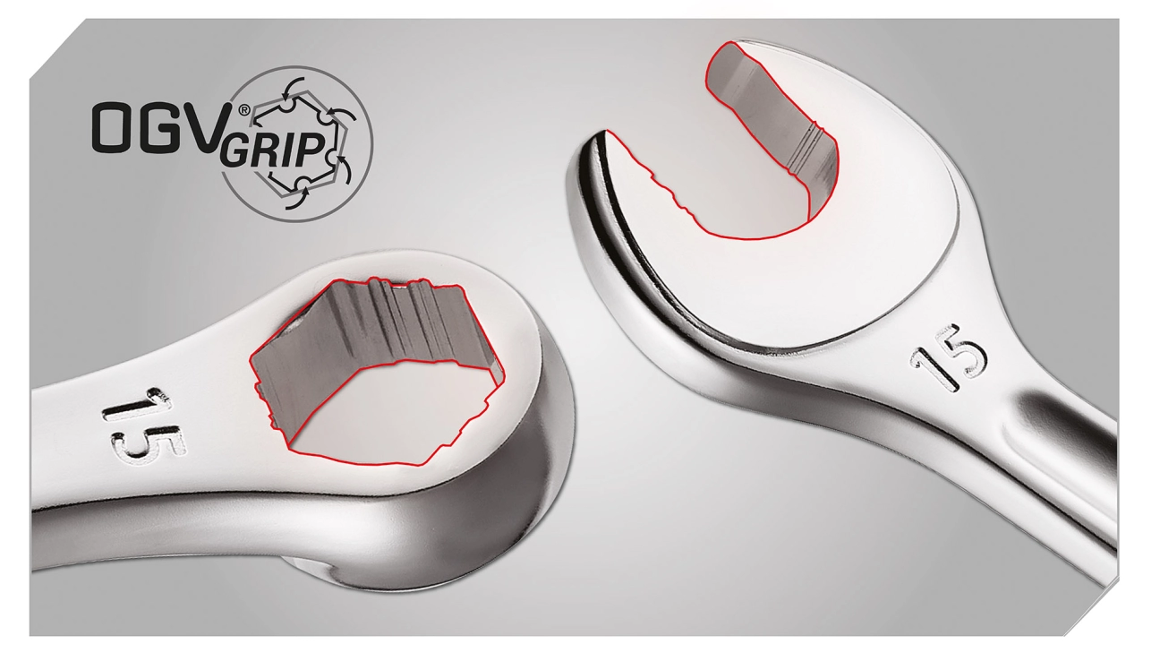 La nuova generazione di chiavi combinate Facom OGV Grip lunghe è stata sviluppata per ottimizzare la presa su dadi arrotondati o ossidati. Offre una presa ad alta coppia e una soluzione meno radicale rispetto all'uso di utensili come estrattori o pinze. Grazie al profilo OGV Grip, brevettato dalla marca, questa chiave aumenta notevolmente la presa proteggendo il bullone o il dado e consentendo l'allentamento delle giunzioni più dure e ostinate. Il lato esagonale consente una coppia di serraggio superiore dell'80% rispetto a una chiave convenzionale e del 60% per la chiave.