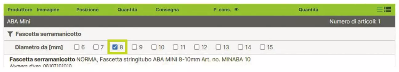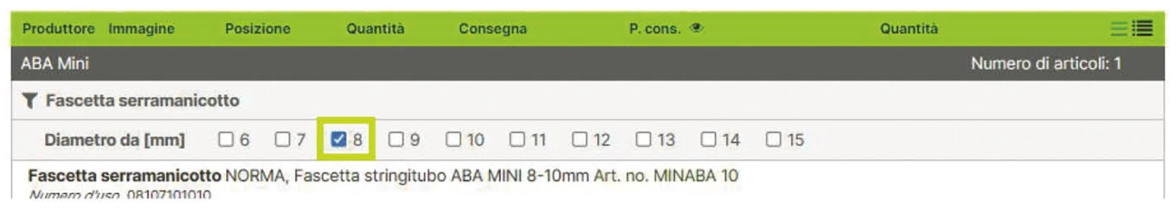 5. Seleziona il diametro desiderato nella funzione filtro: campo di serraggio 8 mm.